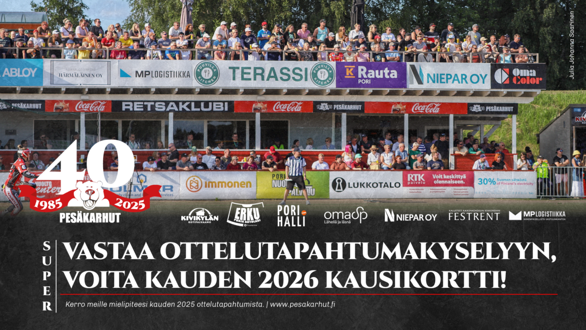 Kerro meille, mitä mieltä olit Pesäkarhujen ottelutapahtumien järjestelyistä ja tarjonnasta kaudella 2025. Kaikkien yhteystietonsa antaneiden kesken arvotaan yksi kausikortti (arvo 169 €) ensikauden tulikuumiin otteluihin!